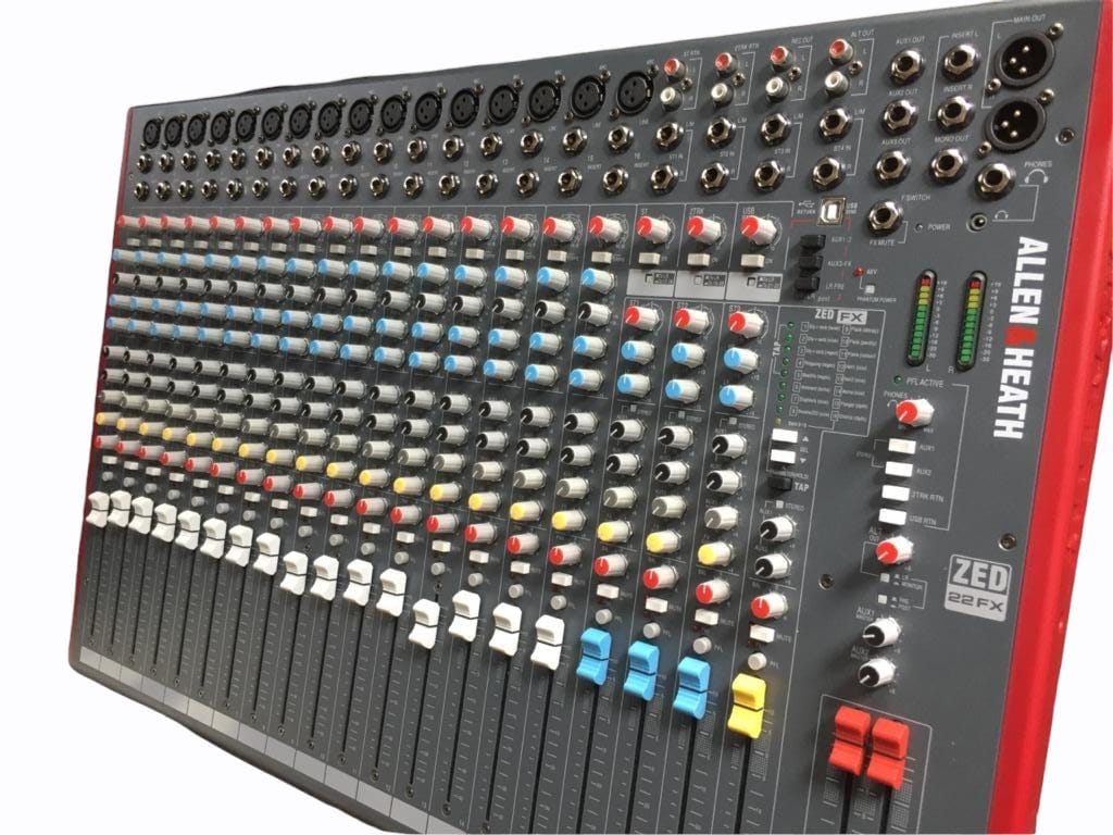 20 MONO AND 6 STEREO INPUTS, 4 AUX BUSSES FOR EFFECTS, COMP: 1-KNOB COMPRESSOR THRESHOLD: +22 DBU TO -8 DBU, RATIO: 1:1 TO 4:1, OUTPUT LEVEL: 0 DB TO 7 DB, ATTACK TIME: APPROX. 25 MSEC, RELEASE TIME: APPROX. 300 MSEC, EQ HIGH: GAIN: +15 DB/-15 DB, FREQUENCY: 10 KHZ SHELVING, EQ MID: GAIN: +15 DB/-15 DB, FREQUENCY: 2.5KHZ PEAKING, EQ LOW: GAIN: +15 DB/-15 DB, FREQUENCY: 100 HZ SHELVING